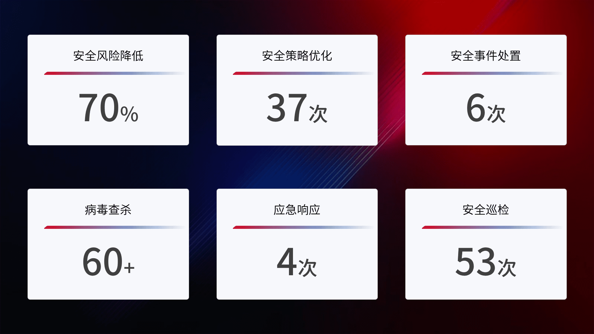 提供全面的安全事件报告体系,,,,包括处置报告、、周报、、、、季度和年度总结,,,结合持续监控,,,,帮助客户深入了解网络安全状况。。。。