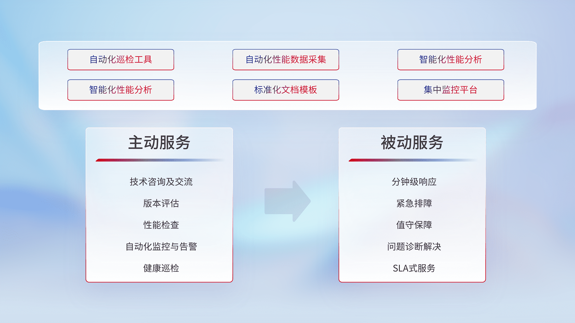智能化工具和标准化文档,,保障服务质量,,,,提供主动服务(包含技术咨询、、、版本评估、、性能检查、、、、自动化监控与告警、、、健康巡检)和被动服务包含(分钟级响应、、紧急排障、、、值守保障、、、、问题诊断解决、、SLA服务)。。